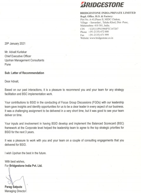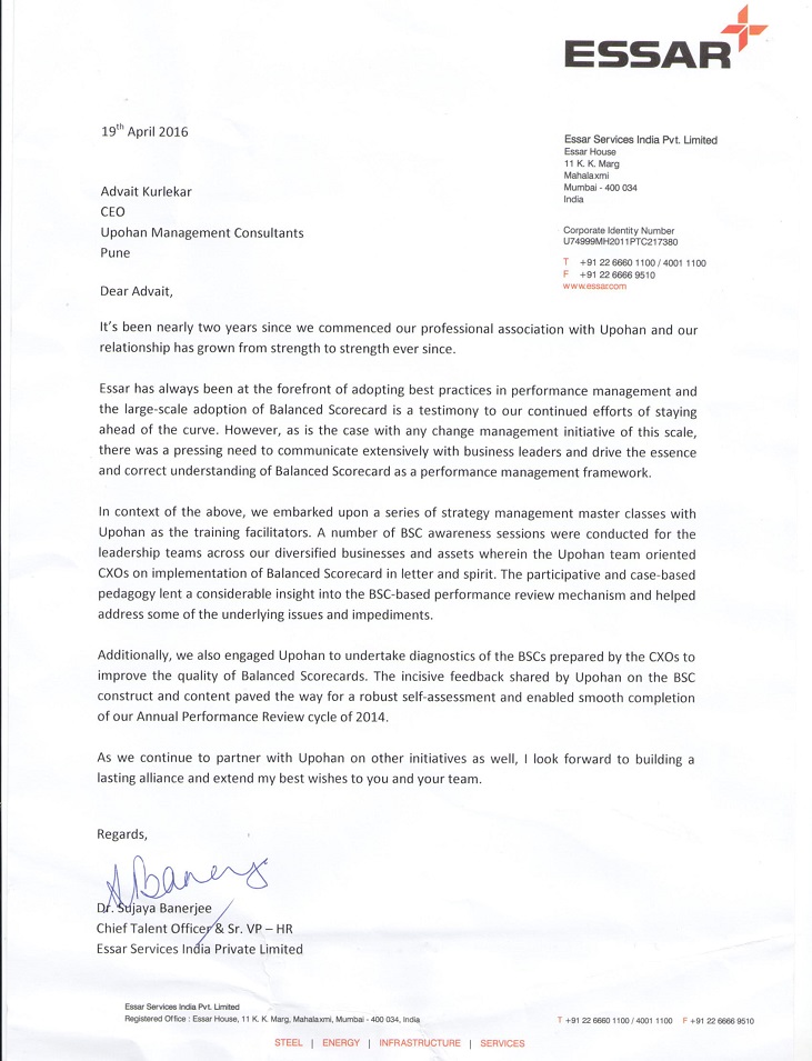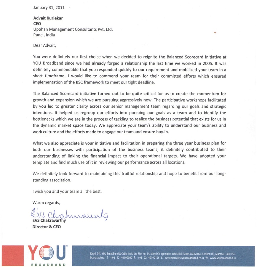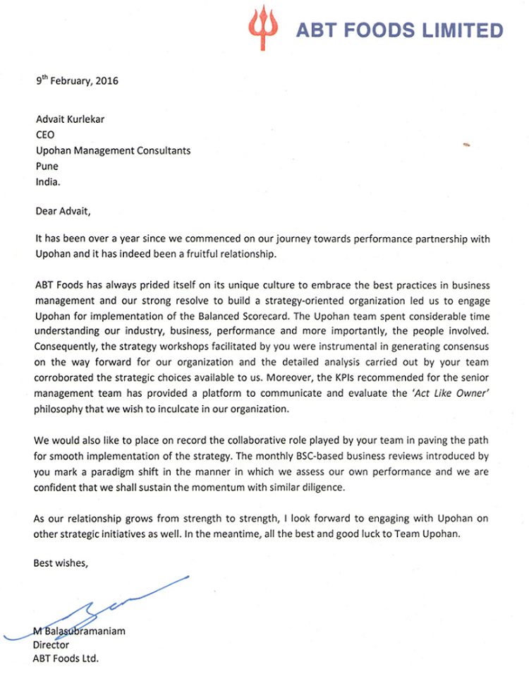 Our strong resolve to build a strategy-oriented organization led us to engage for implementation of the Balanced Scorecard. The team spent considerable time understanding our industry, business, performance and more importantly, the people involved. Consequently, the strategy workshops facilitated by you were instrumental in generating consensus on the way forward for our organization and the detailed analysis carried out by the team corroborated the strategic choices available to us. As our relationship grows from strength to strength, I look forward to engaging with on other strategic initiatives.