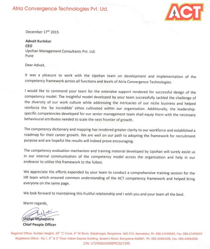 It was a pleasure to work with the team on development and implementation of the competency framework across all functions and levels of ACT. I would like to commend the team for extensive support rendered for successful design of the competency model that successfully tackled the challenge of the diversity of our work culture while addressing the intricacies of our niche business. The competency dictionary and mapping has rendered greater clarity to our workforce and established a roadmap for their career growth. We look forward to maintaining this relationship.