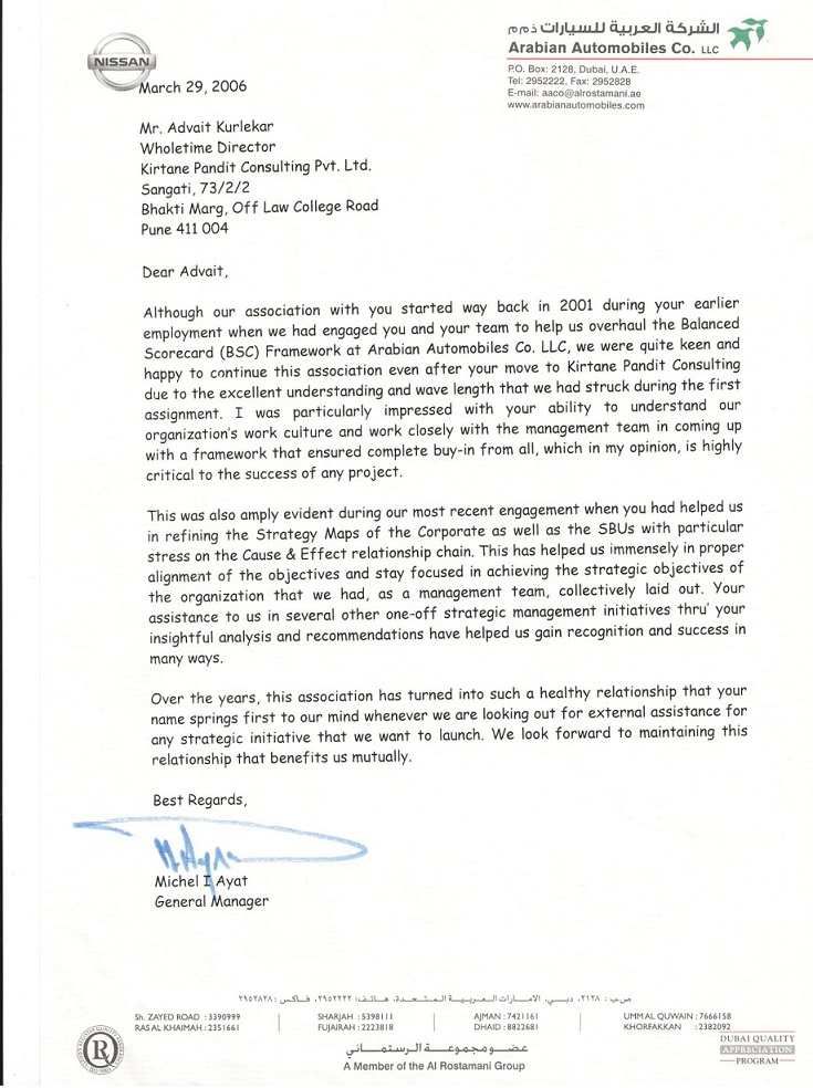 was our first choice when we decided to reignite the Balanced Scorecard initiative. It was commendable that they mobilized their team in a short timeframe. I would like to commend the team for their committed efforts, which ensured implementation of the BSC framework to meet our tight deadline. What we also appreciate is your initiative and facilitation in preparing the three year business plan with participation of the business teams, it definitely contributed to their understanding of linking the financial impact to their operational targets.