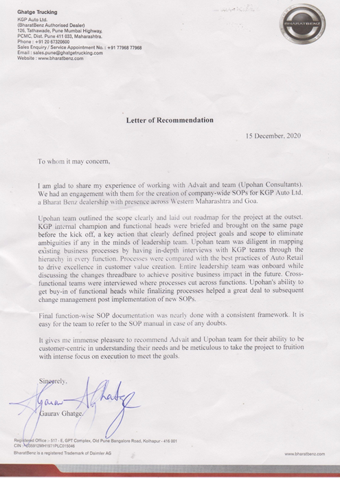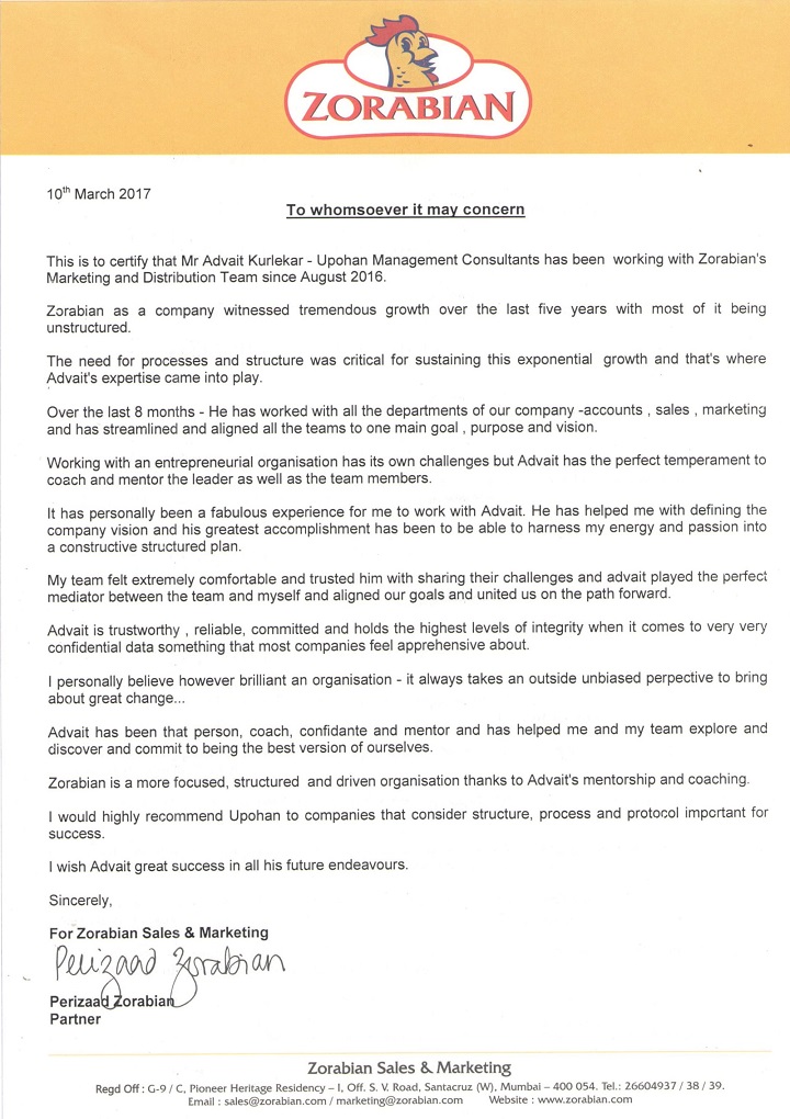 This is to certify that Mr Advait Kurlekar - Management Consultants has been working with Zorabian's Marketing and Distribution Team since August 2016. Zorabian as a company witnessed tremendous growth over the last five years with most of it being unstructured. The need for processes and structure was critical for sustaining this exponential growth and that's where Advait's expertise came into play. Over the last 8 months - He has worked with all the departments of our company -accounts , sales , marketing and has streamlined and aligned all the teams to one main goal , purpose and vision.