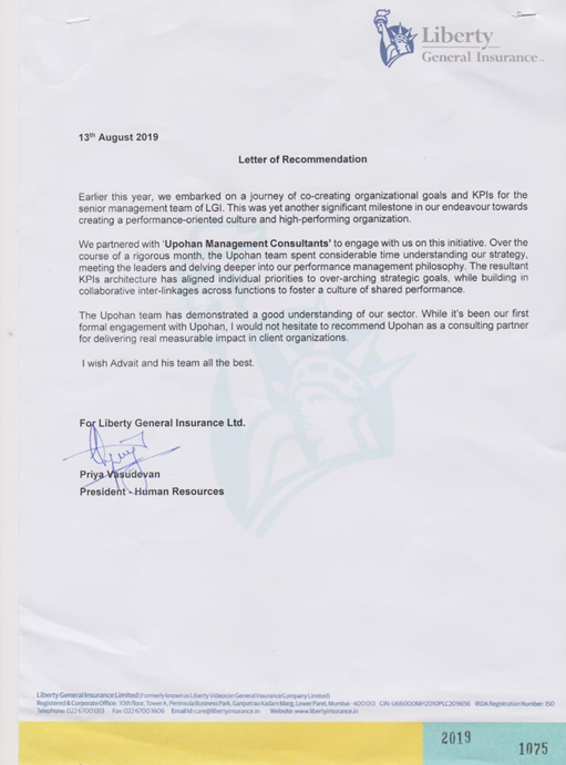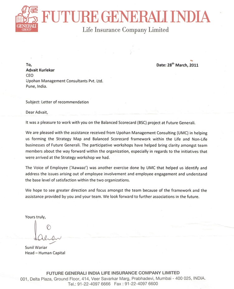 We are pleased with the assistance received from Management Consulting in helping us forming the Strategy Map and Balanced Scorecard framework within the Life and Non-Life businesses of Future Generali. The voice of employee ('Awaaz') was another exercise done by that helped us identify and address the issues arising out of employee involvement and employee engagement and understand the base level of satisfaction within the two organizations. We hope to see greater direction and focus amongst the team because of the framework and the assistance provided by the team. We look forward to further associations in the future.