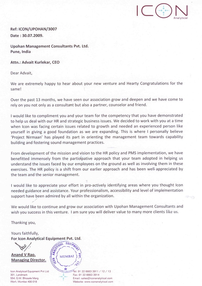From development of the mission and vision to the HR policy and PMS implementation, we have benefitted immensely from the participative approach that your team adopted in helping us understand the issues faced by our employees on the ground as well as involving them in these exercises. The HR policy is a shift from our earlier approach and has been well appreciated by the team and senior management. Your professionalism, accessibility and level of implementation support have been admired by all in the organization.