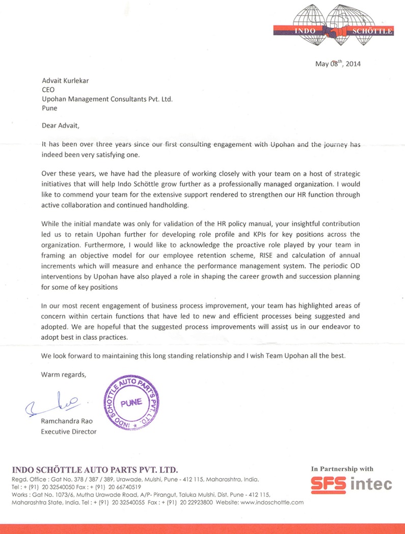 Over the years we have had the pleasure of working closely with on a host of strategic initiatives that will help Indo Schottle grow further as a professionally managed organization. I would like to commend the team for the extensive support rendered to strengthen our HR function through active collaboration and continued hand-holding. While the initial mandate was only for validation of the HR policy manual, their insightful contribution led us to retain further for developing role profile and KPIs for key positions across the organization.