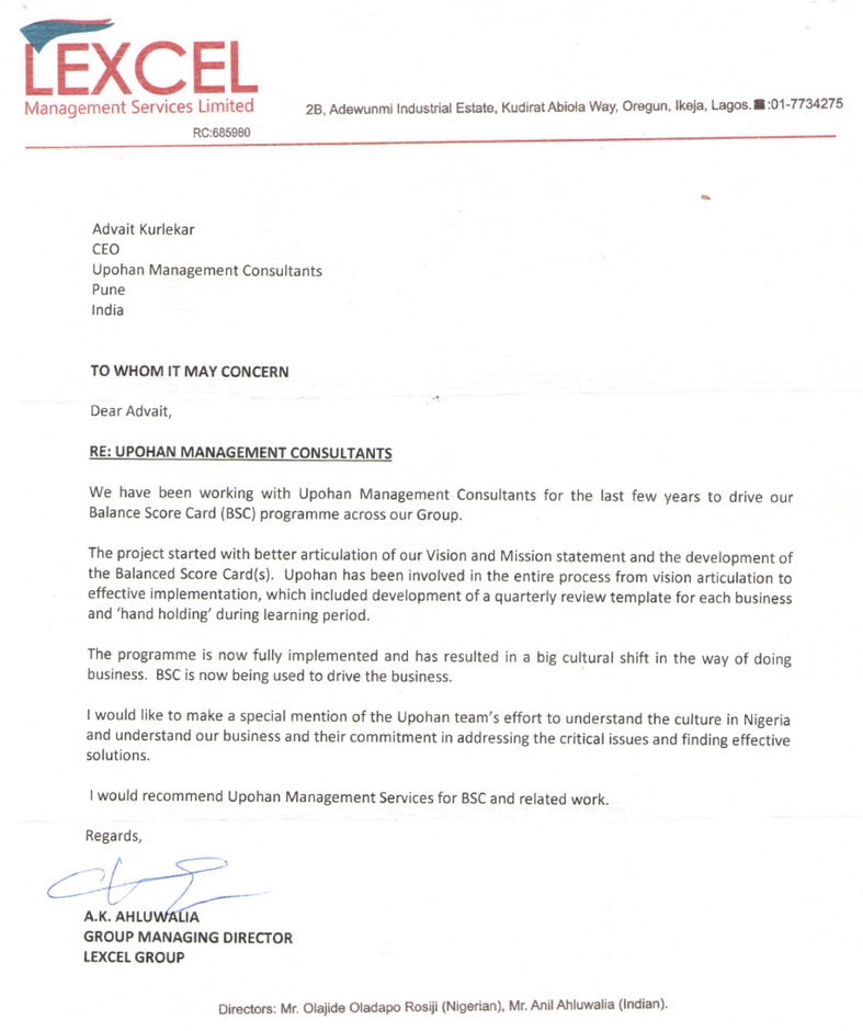 We have been working with for the last few years to drive our Balanced Scorecard programme across our group. had been involved in the entire process from vision articulation to effective implementation, which included the development of a quarterly review template and hand-holding during the learning period. The programme is now fully implemented and has resulted in a big cultural shift in the way of doing business. I would like to specially mention 's effort to understand the culture in Nigeria, understand our business and their commitment to addressing critical issues and finding effective solutions.