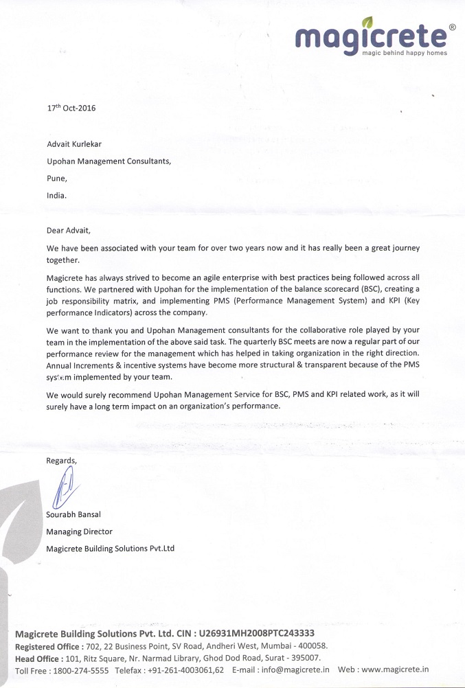 We have been associated with your team for over two years now and it has really been a great journey together. Magicrete has always strived to become an agile enterprise with best practices being followed across all functions. We partnered with for the implementation of the balance scorecard (BSC), creating a job responsibility matrix, and implementing PMS (Performance Management System) and KPI (Key performance Indicators) across the company