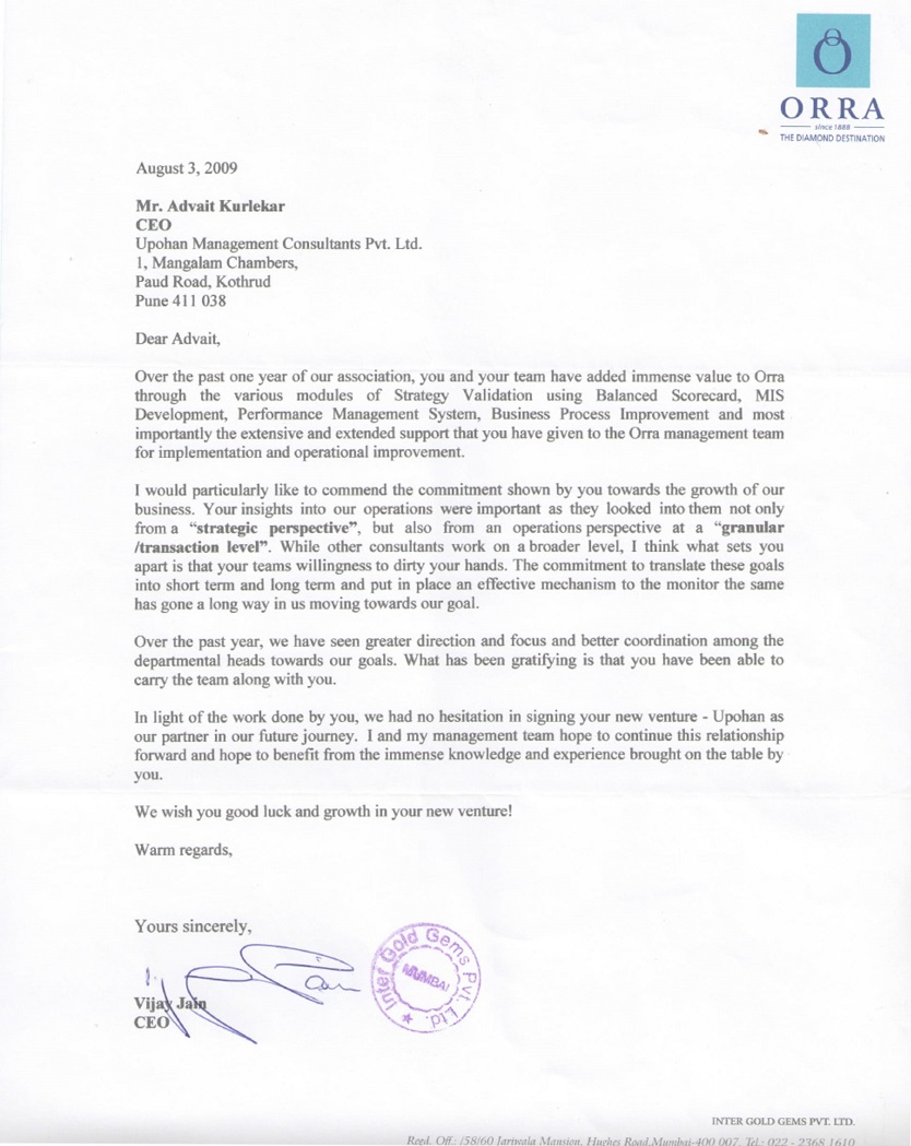 Over the several years of our association, your team has added immense value to Orra through the various models of Strategic Validation using Balanced Scorecard, MIS Development, Performance Management System, Business Process Improvement and most importantly the extensive and extended support that has given the Orra management team for implementation and operational improvement. Your insights into our operations were important as you looked into them not only from a ' strategic perspective ' but also from an operations perspective at a 'granular/ transactional level'. While other consultants work at a broader level, I think what sets apart is the team's willingness to dirty their hands.